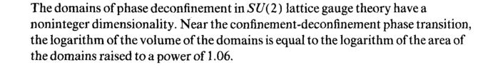 The domains of phase deconfinement in SU (2) lattice gauge theory have a noninteger dimensionality. Near the confinement-deconiinement phase transition, the logarithm of the volume of the domains is equal to the logarithm of the area of the domains raised to a power of 1.06.