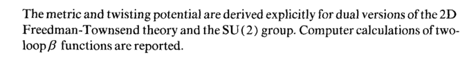 The metric and twisting potential are derived explicitly for dual versions of the 2D Freedman-Townsend theory and the SU(2) group. Computer calculations of two-loop/? functions are reported.