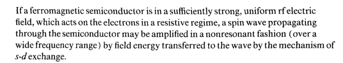 If a ferromagnetic semiconductor is in a sufficiently strong, uniform rf electric field, which acts on the electrons in a resistive regime, a spin wave propagating through the semiconductor may be amplified in a nonresonant fashion (over a wide frequency range) by field energy transferred to the wave by the mechanism of s-d exchange.