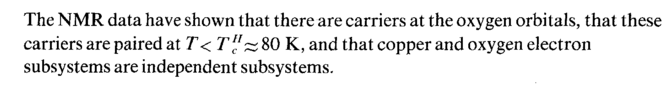 The NMR data have shown that there are carriers at the oxygen orbitals, that these carriers are paired at T< Τ*/~ 80 К, and that copper and oxygen electron subsystems are independent subsystems.