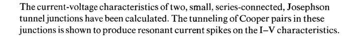 The current-voltage characteristics of two, small, series-connected, Josephson tunnel junctions have been calculated. The tunneling of Cooper pairs in these junctions is shown to produce resonant current spikes on the I-V characteristics.
