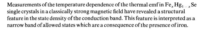 Measurements of the temperature dependence of the thermal emf in Fex Hg l _ x Se single crystals in a classically strong magnetic field have revealed a structural feature in the state density of the conduction band. This feature is interpreted as a narrow band of allowed states which are a consequence of the presence of iron.