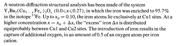 A neutron-diffraction structural analysis has been made of the system YIBa2(Cu1 _xFex )3)Oy (0.0<x<0.27), in which the iron was enriched to 95.7% in the isotope 57Fe. Up to x0 — 0.10, the iron atoms lie exclusively at Cu 1 sites. At a higher concentration χ = x0 + Ajc, the "excess" iron Δλ; is distributed equiprobably between Cu 1 and Cu2 sites. The introduction of iron results in the capture of additional oxygen, in an amount of 0.5 of an oxygen atom per iron cation.