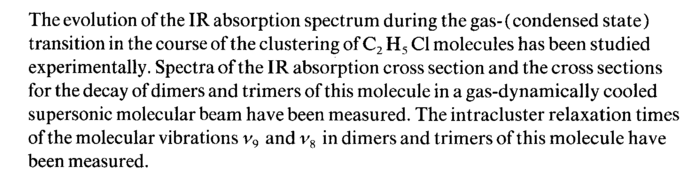 The evolution of the IR absorption spectrum during the gas(condensed state) transition in the course of the clustering of C2 H5 CI molecules has been studied experimentally. Spectra of the IR absorption cross section and the cross sections for the decay of dimers and trimers of this molecule in a gas-dynamically cooled supersonic molecular beam have been measured. The intracluster relaxation times of the molecular vibrations v9 and v8 in dimers and trimers of this molecule have been measured.