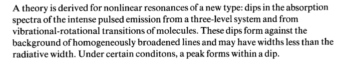A theory is derived for nonlinear resonances of a new type: dips in the absorption spectra of the intense pulsed emission from a three-level system and from vibrational-rotational transitions of molecules. These dips form against the background of homogeneously broadened lines and may have widths less than the radiative width. Under certain conditons, a peak forms within a dip.