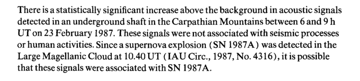 There is a statistically significant increase above the background in acoustic signals detected in an underground shaft in the Carpathian Mountains between 6 and 9 h UT on 23 February 1987. These signals were not associated with seismic processes or human activities. Since a supernova explosion (SN 1987A) was detected in the Large Magellanic Cloud at 10.40 UT (IAU Circ, 1987, No. 4316), it is possible that these signals were associated with SN 1987A.