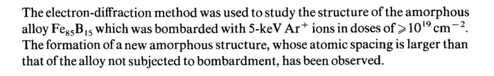 The electron-diffraction method was used to study the structure of the amorphous alloy Fe85B ,5 which was bombarded with 5-keV Ar + ions in doses of > 1019 cm-2. The formation of a new amorphous structure, whose atomic spacing is larger than that of the alloy not subjected to bombardment, has been observed.