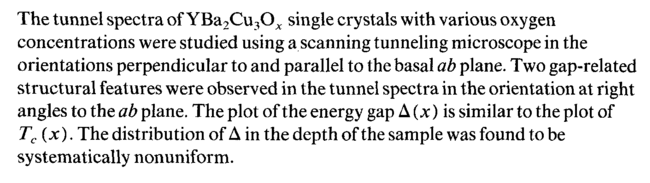The tunnel spectra of YBa^Cu^O^ single crystals with various oxygen concentrations were studied using a scanning tunneling microscope in the orientations perpendicular to and parallel to the basal ab plane. Two gap-related structural features were observed in the tunnel spectra in the orientation at right angles to the ab plane. The plot of the energy gap Δ (χ) is similar to the plot of Tc{x). The distribution of Δ in the depth of the sample was found to be systematically nonuniform.