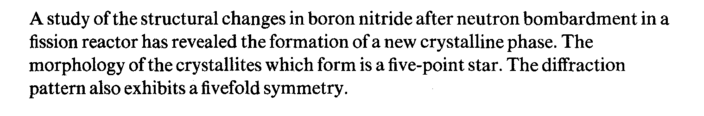 A study of the structural changes in boron nitride after neutron bombardment in a fission reactor has revealed the formation of a new crystalline phase. The morphology of the crystallites which form is a five-point star. The diffraction pattern also exhibits a fivefold symmetry.