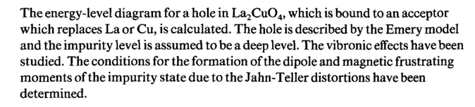 The energy-level diagram for a hole in La2Cu04, which is bound to an acceptor which replaces La or Cu, is calculated. The hole is described by the Emery model and the impurity level is assumed to be a deep level. The vibronic effects have been studied. The conditions for the formation of the dipole and magnetic frustrating moments of the impurity state due to the Jahn-Teller distortions have been determined.