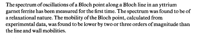 The spectrum of oscillations of a Bloch point along a Bloch line in an yttrium garnet ferrite has been measured for the first time. The spectrum was found to be of a relaxational nature. The mobility of the Bloch point, calculated from experimental data, was found to be lower by two or three orders of magnitude than the line and wall mobilities.