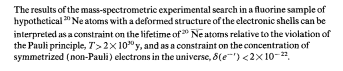 The results of the mass-spectrometric experimental search in a fluorine sample of hypothetical20 Ne atoms with a deformed structure of the electronic shells can be interpreted as a constraint on the lifetime of20 Ne atoms relative to the violation of the Pauli principle, Γ> 2 Χ ΙΟ30y, and as a constraint on the concentration of symmetrized (non-Pauli) electrons in the universe, S(e~~') <2X 10~22