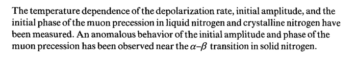 The temperature dependence of the depolarization rate, initial amplitude, and the initial phase of the muon precession in liquid nitrogen and crystalline nitrogen have been measured. An anomalous behavior of the initial amplitude and phase of the muon precession has been observed near the α-β transition in solid nitrogen.
