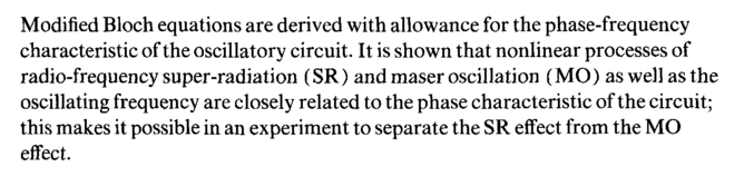 Modified Bloch equations are derived with allowance for the phase-frequency characteristic of the oscillatory circuit. It is shown that nonlinear processes of radio-frequency super-radiation (SR) and maser oscillation (MO) as well as the oscillating frequency are closely related to the phase characteristic of the circuit; this makes it possible in an experiment to separate the SR eifect from the MO effect.