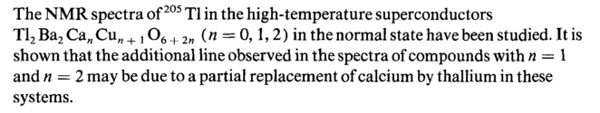 The NMR spectra of Tl in the high-temperature superconductors Tl2 Ba2 Ca„ Cu„ + 106 + 2w (n = 0,1,2) in the normal state have been studied. It is shown that the additional line observed in the spectra of compounds with η = 1 and η = 2 may be due to a partial replacement of calcium by thallium in these systems.