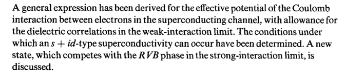A general expression has been derived for the effective potential of the Coulomb interaction between electrons in the superconducting channel, with allowance for the dielectric correlations in the weak-interaction limit. The conditions under which an s + id-type superconductivity can occur have been determined. A new state, which competes with the R VB phase in the strong-interaction limit, is discussed.