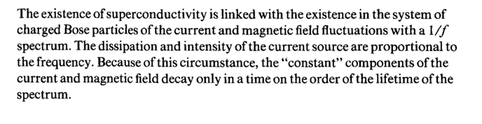 The existence of superconductivity is linked with the existence in the system of charged Bose particles of the current and magnetic field fluctuations with a l/f spectrum. The dissipation and intensity of the current source are proportional to the frequency. Because of this circumstance, the "constant" components of the current and magnetic field decay only in a time on the order of the lifetime of the spectrum.