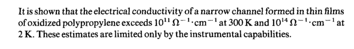 It is shown that the electrical conductivity of a narrow channel formed in thin films of oxidized polypropylene exceeds 1011 il"1 * cm ~1 at 300 К and 1014 fl ~1 · cm ~1 at 2 K, These estimates are limited only by the instrumental capabilities.