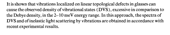 It is shown that vibrations localized on linear topological defects in glasses can cause the observed density of vibrational states (DVS), excessive in comparison to the Debye density, in the 2-10 meV energy range. In this approach, the spectra of DVS and of inelastic light scattering by vibrations are obtained in accordance with recent experimental results.
