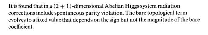 It is found that in a (2 + 1) -dimensional Abelian Higgs system radiation corrections include spontaneous parity violation. The bare topological term evolves to a fixed value that depends on the sign but not the magnitude of the bare coefficient.