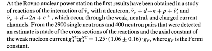 At the Rovno nuclear power station the first results have been obtained in a study of reactions of the interaction of ve with a deuteron, ve + d^n + ρ + v'e and ve + In + e + , which occur through the weak, neutral, and charged current channels. From the 2900 single neutrons and 400 neutron pairs that were detected an estimate is made of the cross sections of the reactions and the axial constant of the weak nucleon currentg^c;g^c = 1.25· (1.06 ±0.16) -gF, wheregF is the Fermi constant.