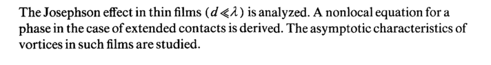 The Josephson effect in thin films (d<^A) is analyzed. A nonlocal equation for a phase in the case of extended contacts is derived. The asymptotic characteristics of vortices in such films are studied.