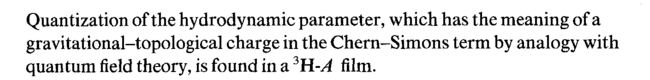 Quantization of the hydrodynamic parameter, which has the meaning of a gravitational-topological charge in the Chern-Simons term by analogy with quantum field theory, is found in a 3H-A film.