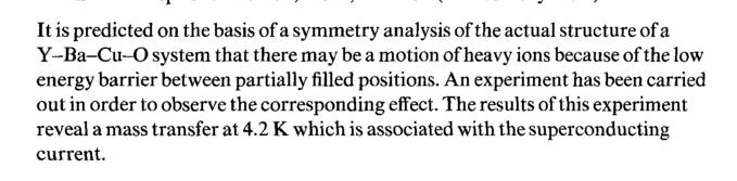 It is predicted on the basis of a symmetry analysis of the actual structure of a Y-Ba-Cu-O system that there may be a motion of heavy ions because of the low energy barrier between partially filled positions. An experiment has been carried out in order to observe the corresponding effect. The results of this experiment reveal a mass transfer at 4.2 К which is associated with the superconducting current.