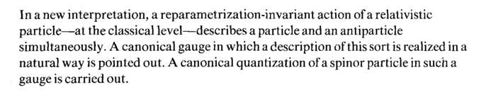In a new interpretation, a reparametrization-invariant action of a relativistic particle—at the classical level—describes a particle and an antiparticle simultaneously. A canonical gauge in which a description of this sort is realized in a natural way is pointed out. A canonical quantization of a spinor particle in such a gauge is carried out.