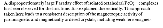 A disproportionately large Faraday effect of isolated octahedral FeO^ ~ complexes has been observed for the first time. It is explained theoretically. The approach taken here leads to a consistent description of the magnetooptic activity of paramagnetic and magnetically ordered crystals, including weak ferromagnets.