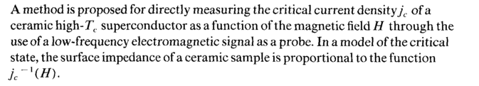 A method is proposed for directly measuring the critical current density /,, of a ceramic high-Fc superconductor as a function of the magnetic field Η through the use of a low-frequency electromagnetic signal as a probe. In a model of the critical state, the surface impedance of a ceramic sample is proportional to the function