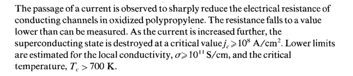 The passage of a current is observed to sharply reduce the electrical resistance of conducting channels in oxidized polypropylene. The resistance falls to a value lower than can be measured. As the current is increased further, the superconducting state is destroyed at a critical value jc > 108 A/cm2. Lower limits are estimated for the local conductivity, <7> 10м S/cm, and the critical temperature, Tc > 700 K.