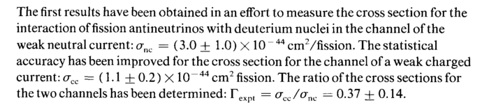 The first results have been obtained in an effort to measure the cross section for the interaction of fission antineutrinos with deuterium nuclei in the channel of the weak neutral current: anc = (3.0+ 1.0) X 10 ~ 44 cm Vfission. The statistical accuracy has been improved for the cross section for the channel of a weak charged current: acc — (1.1 + 0.2) Χ 10-44 cm2 fission. The ratio of the cross sections for the two channels has been determined: Γ t = σο0/σης. — 0.37 ± 0.14.