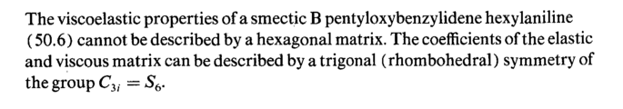 The viscoelastic properties of a smectic В pentyloxybenzylidene hexylaniline (50.6) cannot be described by a hexagonal matrix. The coefficients of the elastic and viscous matrix can be described by a trigonal (rhombohedral) symmetry of the group C3, =S6.