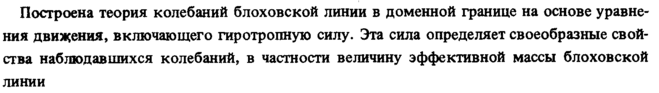 Построена теория колебаний блоховской линии в доменной границе на основе уравнения движения, включающего гиротропную силу. Эта сила определяет своеобразные свойства наблюдавшихся колебаний, в частности величину эффективной массы блоховской линии