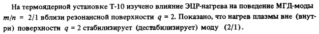 На термоядерной установке Т-10 изучено влияние ЭЦР-нагрева на поведение МГД-моды т(п = 2/1 вблизи резонансной поверхности q = 2. Показано, что нагрев плазмы вне (внутри) поверхности q 2 стабилизирует (дестабилизирует) моду (2/1).