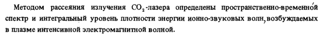 Методом рассеяния излучения С02-лазера определены пространственно-временной спектр и интегральный уровень плотности энергии ионно-звуковых в олн? возбуждаемых в плазме интенсивной электромагнитной волной.