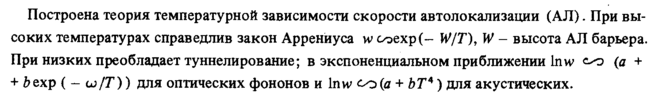 Построена теория температурной зависимости скорости автолокализации (АЛ). При высоких температурах справедлив закон Аррениуса w соехр(W/T), W высота АЛ барьера. При низких преобладает туннелирование; в экспоненциальном приближении lnw с-о (а + + Ьехр ( ω/Τ)) для оптических фононов и lnw со (я + ЬТА) для акустических.