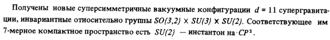 Получены новые суперсимметричные вакуумные конфигурации d = 11 супергравитации, инвариантные относительно группы SO(3,2) X SU(3) X SU(2). Соответствующее им 7-мерное компактное пространство есть SU(2) — инстантон на. CP2.