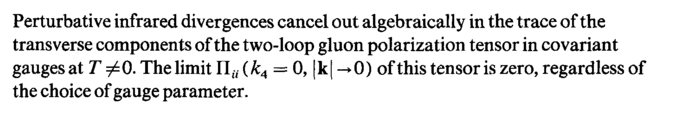 Perturbative infrared divergences cancel out algebraically in the trace of the transverse components of the two-loop gluon polarization tensor in covariant gauges at Τ Φ 0. The limit Пй (k4 = 0, | к [ -> 0) of this tensor is zero, regardless of the choice of gauge parameter.