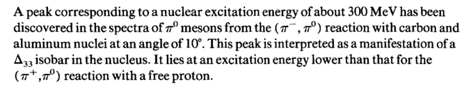 A peak corresponding to a nuclear excitation energy of about 300 MeV has been discovered in the spectra of π° mesons from the (π ~, π°) reaction with carbon and aluminum nuclei at an angle of 10°. This peak is interpreted as a manifestation of a Δ33 isobar in the nucleus. It lies at an excitation energy lower than that for the (77+ ,7T°) reaction with a free proton.