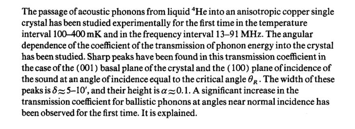 The passage of acoustic phonons from liquid 4He into an anisotropic copper single crystal has been studied experimentally for the first time in the temperature interval 100-400 mK and in the frequency interval 13-91 MHz. The angular dependence of the coefficient of the transmission of phonon energy into the crystal has been studied. Sharp peaks have been found in this transmission coefficient in the case of the (001) basal plane of the crystal and the (100) plane of incidence of the sound at an angle of incidence equal to the critical angle θκ. The width of these peaks is δ ~ 5-10', and their height is a ss 0.1. A significant increase in the transmission coefficient for ballistic phonons at angles near normal incidence has been observed for the first time. It is explained.