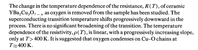 The change in the temperature dependence of the resistance, R (7"), of ceramic YBa2Cu307 _ x as oxygen is removed from the sample has been studied. The superconducting transition temperature shifts progressively downward in the process. There is no significant broadening of the transition. The temperature dependence of the resistivity, ρ (Τ), is linear, with a progressively increasing slope, only at Γ> 400 K. It is suggested that oxygen condenses on Cu-O chains at 7-400 K.