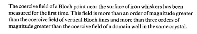 The coercive field of a Bloch point near the surface of iron whiskers has been measured for the first time. This field is more than an order of magnitude greater than the coercive field of vertical Bloch lines and more than three orders of magnitude greater than the coercive field of a domain wall in the same crystal.