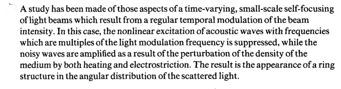 A study has been made of those aspects of a time-varying, small-scale self-focusing of light beams which result from a regular temporal modulation of the beam intensity. In this case, the nonlinear excitation of acoustic waves with frequencies which are multiples of the light modulation frequency is suppressed, while the noisy waves are amplified as a result of the perturbation of the density of the medium by both heating and electrostriction. The result is the appearance of a ring structure in the angular distribution of the scattered light.