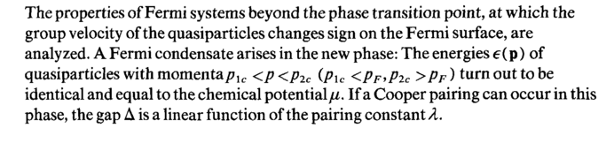 The properties of Fermi systems beyond the phase transition point, at which the group velocity of the quasiparticles changes sign on the Fermi surface, are analyzed. A Fermi condensate arises in the new phase: The energies e(p) of quasiparticles with momenta/7lc <p<p2c (Pic <Pf>Pic >Pf) turn out to be identical and equal to the chemical potential μ. If a Cooper pairing can occur in this phase, the gap Δ is a linear function of the pairing constant λ.