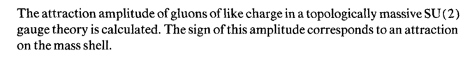 The attraction amplitude of gluons of like charge in a topologically massive SU (2) gauge theory is calculated. The sign of this amplitude corresponds to an attraction on the mass shell.