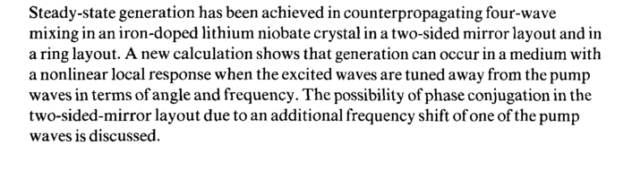 Steady-state generation has been achieved in counterpropagating four-wave mixing in an iron-doped lithium niobate crystal in a two-sided mirror layout and in a ring layout. A new calculation shows that generation can occur in a medium with a nonlinear local response when the excited waves are tuned away from the pump waves in terms of angle and frequency. The possibility of phase conjugation in the two-sided-mirror layout due to an additional frequency shift of one of the pump waves is discussed.