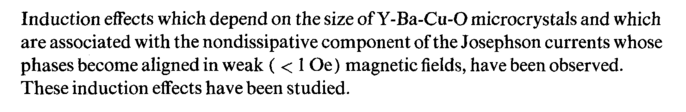 Induction effects which depend on the size of Y-Ba-Cu-O microcrystals and which are associated with the nondissipative component of the Josephson currents whose phases become aligned in weak ( < 1 Oe) magnetic fields, have been observed. These induction effects have been studied.