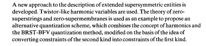 A new approach to the description of extended supersymmetric entities is developed. Twistor-like harmonic variables are used. The theory of zero-superstrings and zero-supermembranes is used as an example to propose an alternative quantization scheme, which combines the concept of harmonics and the BRST-BFV quantization method, modified on the basis of the idea of converting constraints of the second kind into constraints of the first kind.